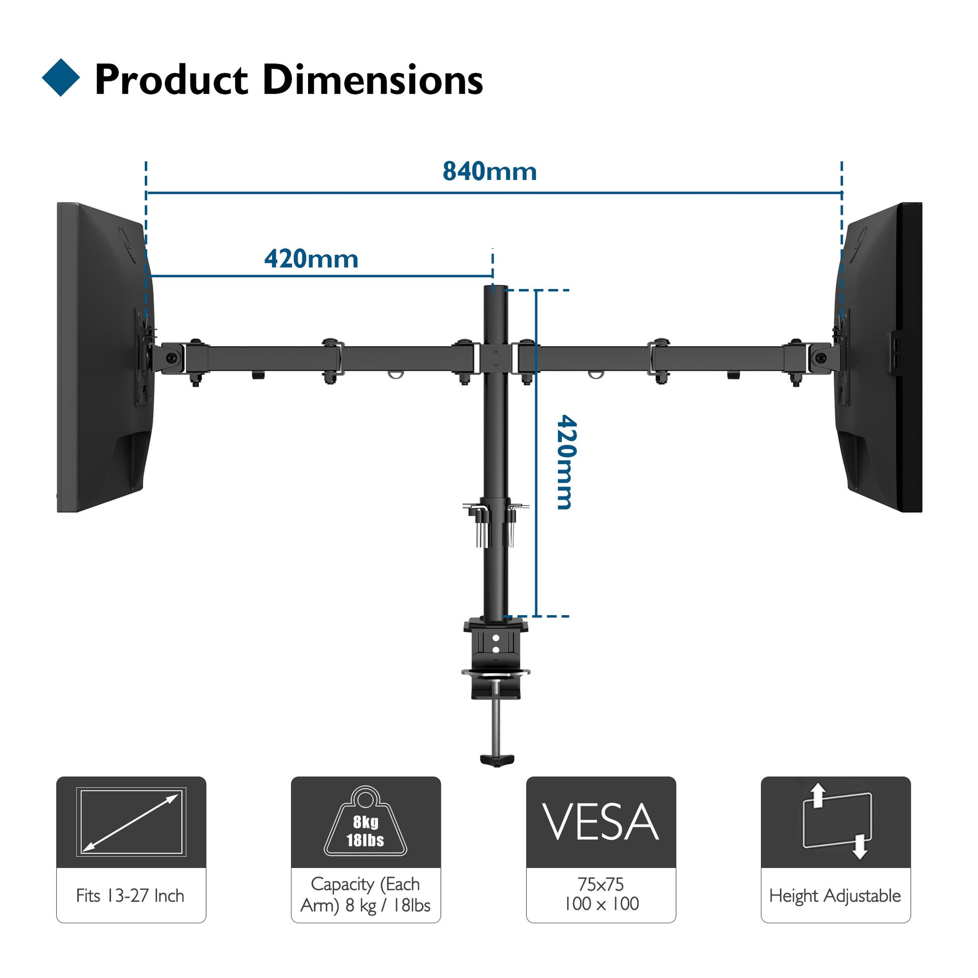 360° DOUBLE-HINGED ARM DESK MOUNT: This monitor stand can mount two screens side by side to conveniently free up desk space. Holds two 13”-27” monitor screens with a maximum load capacity of 8 kg for each arm.