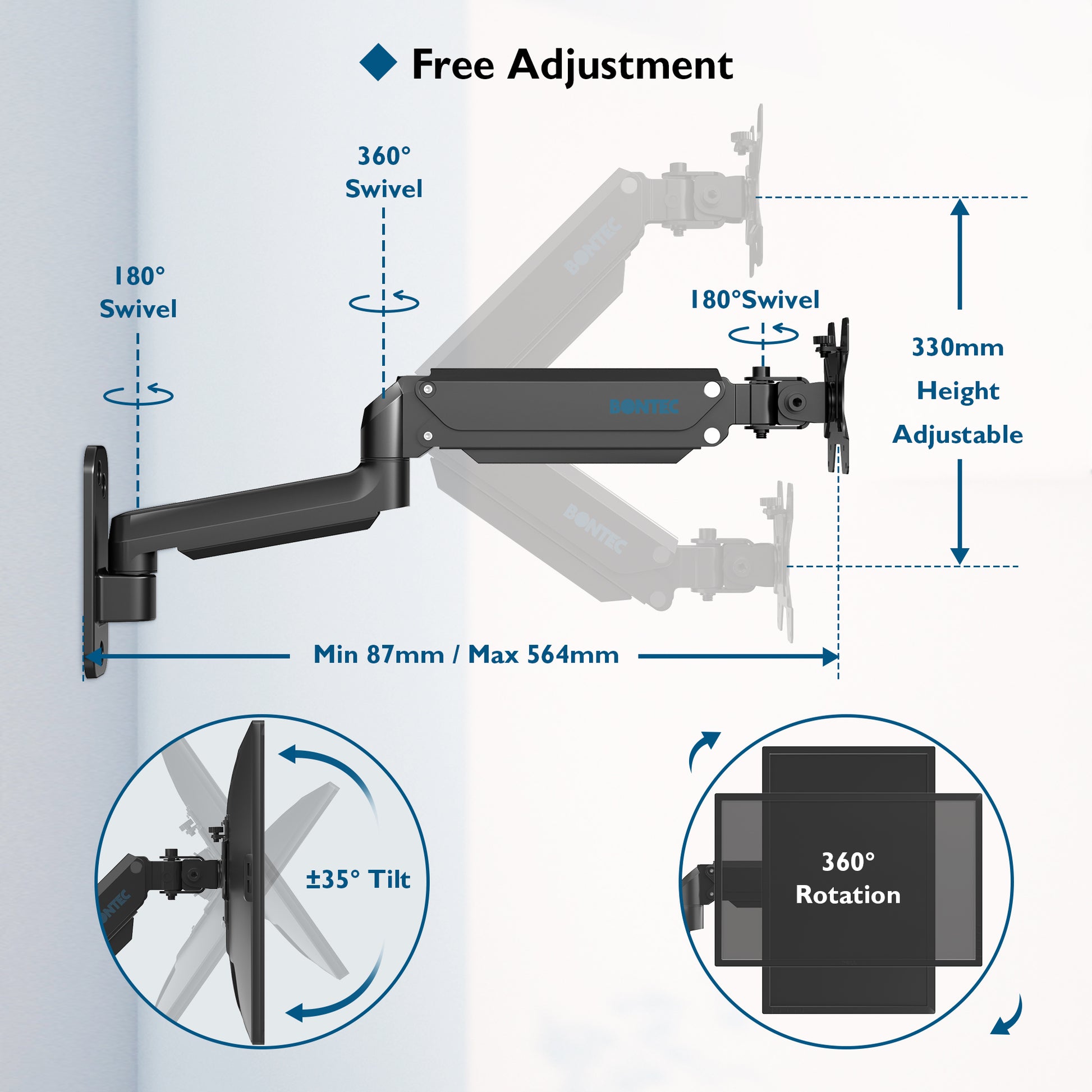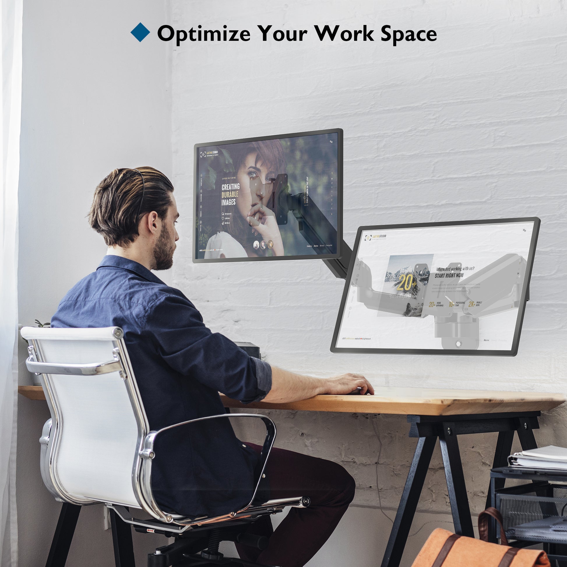 - 【Enhance Space & Comfort】Our dual gas spring arms are suitable for PC monitors and small TVs, perfect for optimizing office and kitchen space or adding something extra to your gaming set-up. Equipped with heavy-duty, height-adjustable arm, this monitor wall mount is strong, sturdy and multi-functional, offering maximum space and comfort.