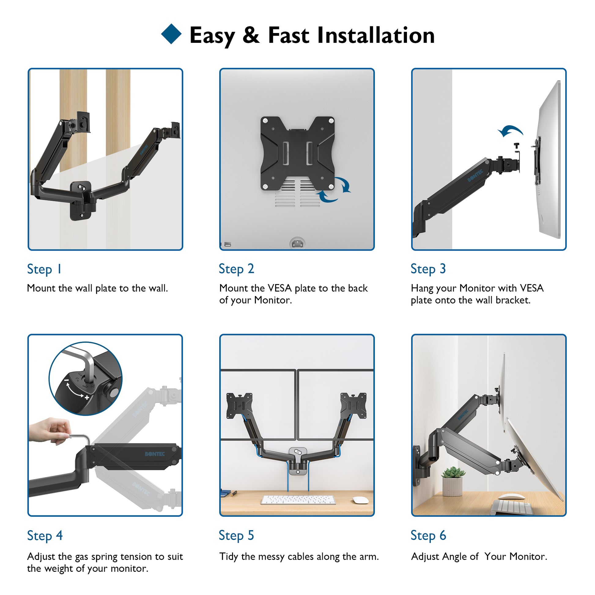 - 【Easy to Install】This double monitor wall mount is easy to install, requiring only three steps to install your screens. First, attach the monitor wall mount to your wall; Second, connect your monitor to the VESA plate; Third, adjust the tension according to your monitor weight. The concealed cable management helps to organize cables for a neat and clean work space.
