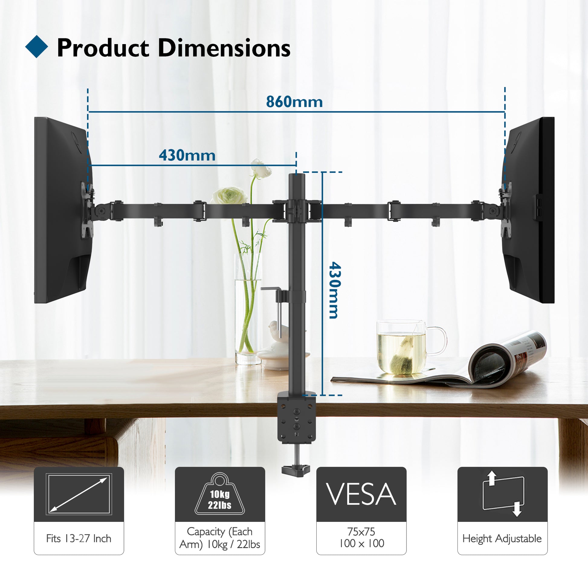 BONTEC Twin Arm Monitor Stand is perfect for any 13”-27” TVs or monitor screens with a maximum load capacity of 10 kg for each arm. Suitable for all flat screen monitors and TVs with VESA sizes of 75x75 mm or 100x100 mm. It has tilt, swivel and height adjustment functions for optimal angle setting.