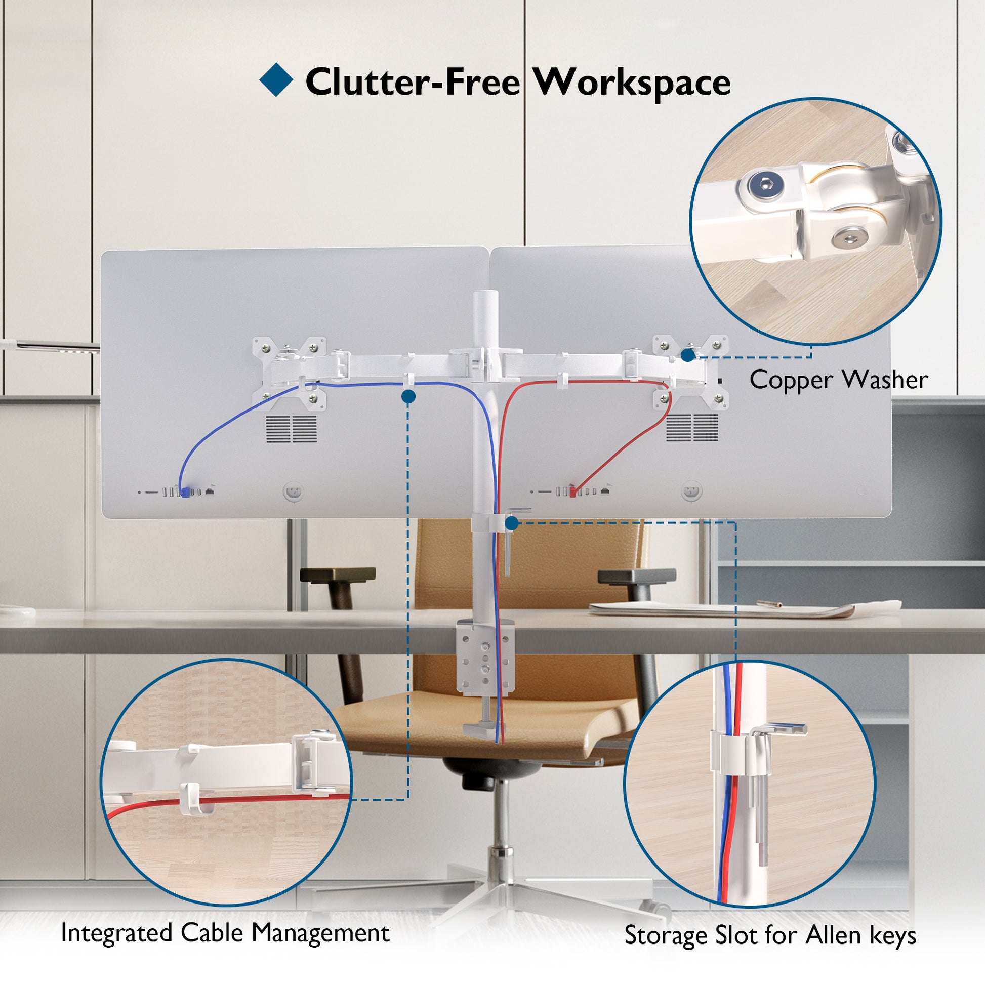 - Special Features: BONTEC dual monitor stand with the concealed wiring design, keeping your desk tidy and clean; This dual monitor stand has storage slot for Allen keys. And this double monitor stand comes complete with instructions plus all fixtures and fittings needed for simple installation. This dual monitor arm get your 2 monitors up and improve your workspace, is your best choice. Bringing you double the visual experience and double the efficiency!