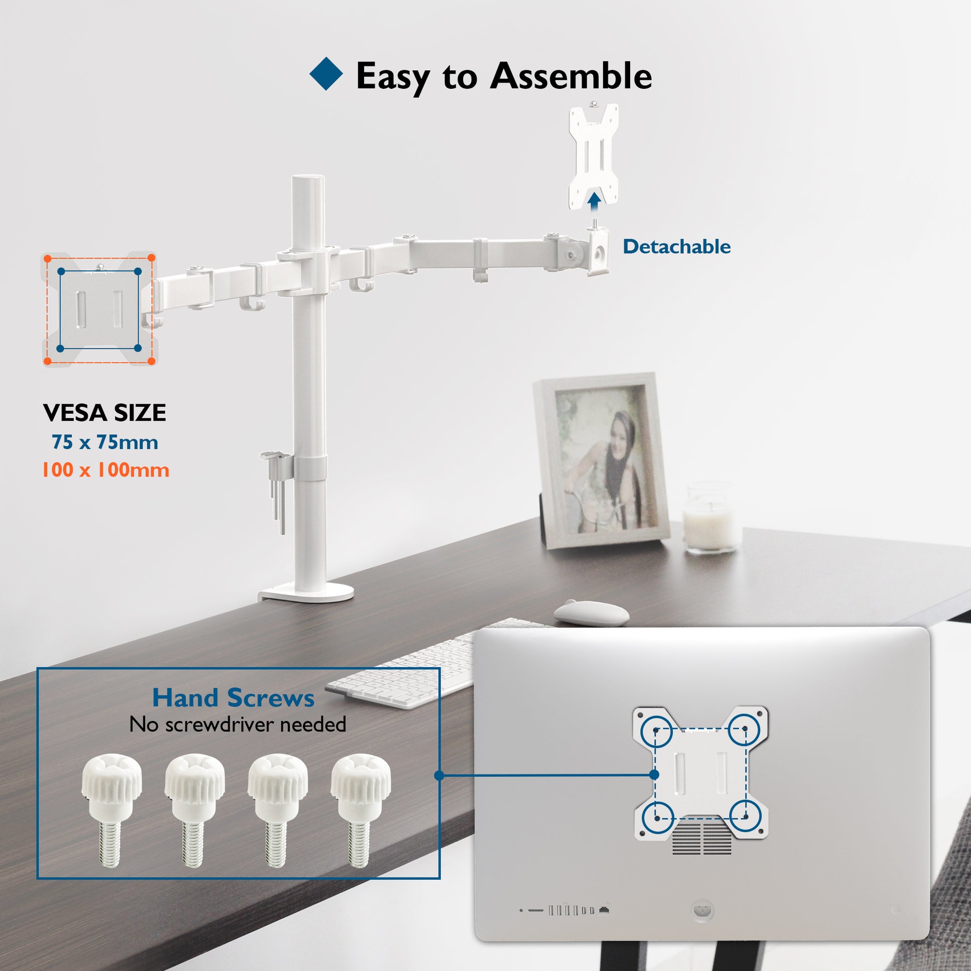 - VESA Compatibility: Our dual monitor stand fits all flat screen monitors and TVs with VESA sizes of 75x75 mm or 100x100 mm (Please ensure your monitor screen is compatible with this mount’s MAX VESA by checking the manual or by measuring the distance between the 4 holes on the rear of the screen); VESA plates for this dual monitor stand are quick fit and detachable for easy installation