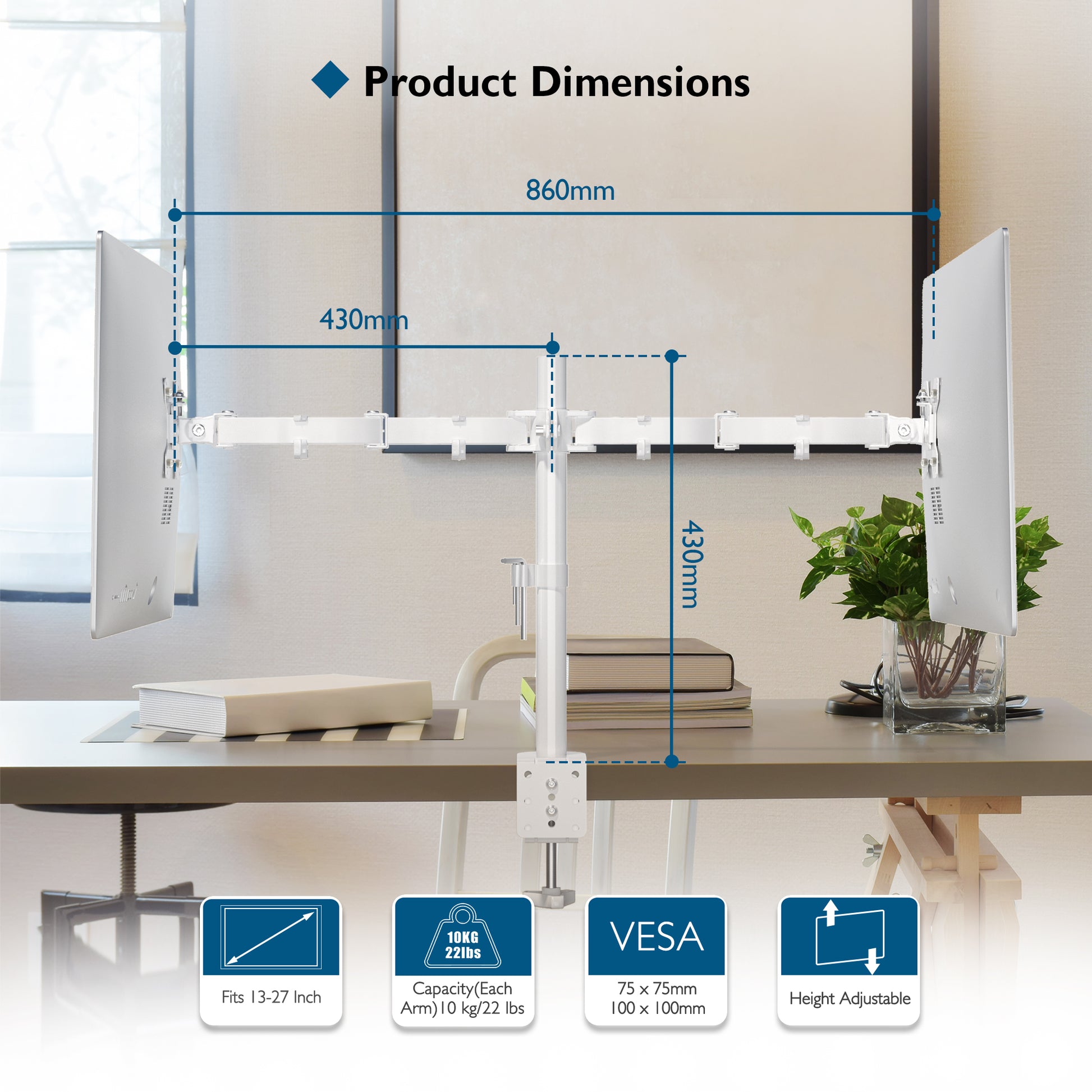 - Strong steel Dual monitor stand: This Dual monitor stand can mount two screens side by side to conveniently free up desk space. Holds two 13”-27” TV or monitors with a maximum load capacity of 10 kg for each arm. For other dual monitor arm in marketplace, this dual monitor mount is a great dual monitor stands for desks
