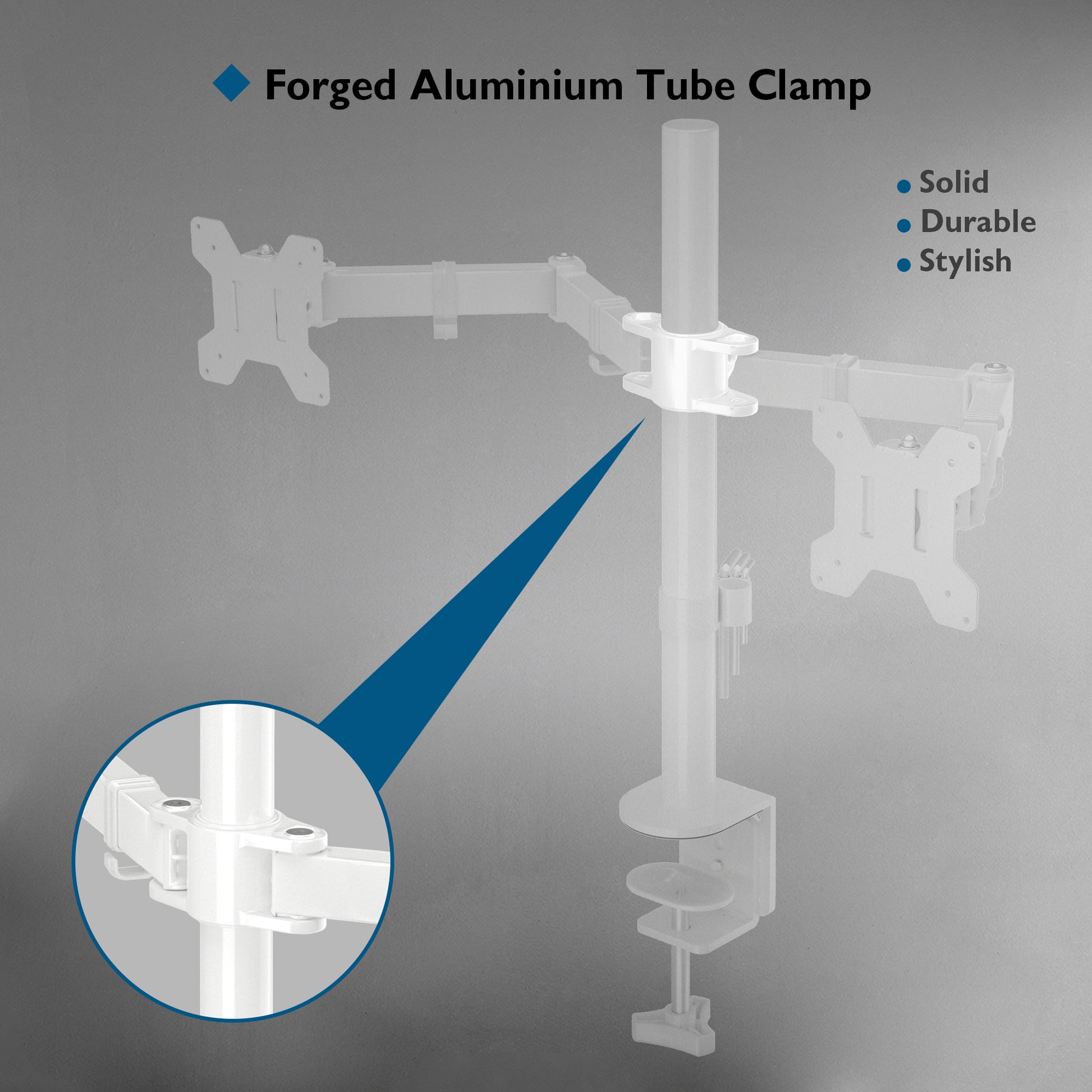 - 2 METHODS of INSTALLATIONS: This dual monitor arm comes with 2 separate mounting choice: - 1) Desk clamp: heavy-duty ‘C’ clamp (fits desk thickness between 10mm and 100mm) offers supreme stability, keeping your screen fixed firmly and safely in place; 2) Grommet base install: fits desks with bolt-through hole (hole diameter supports min.10mm-max.100mm); the grommet base of our dual monitor stand supports desk thickness from 10mm to 85mm