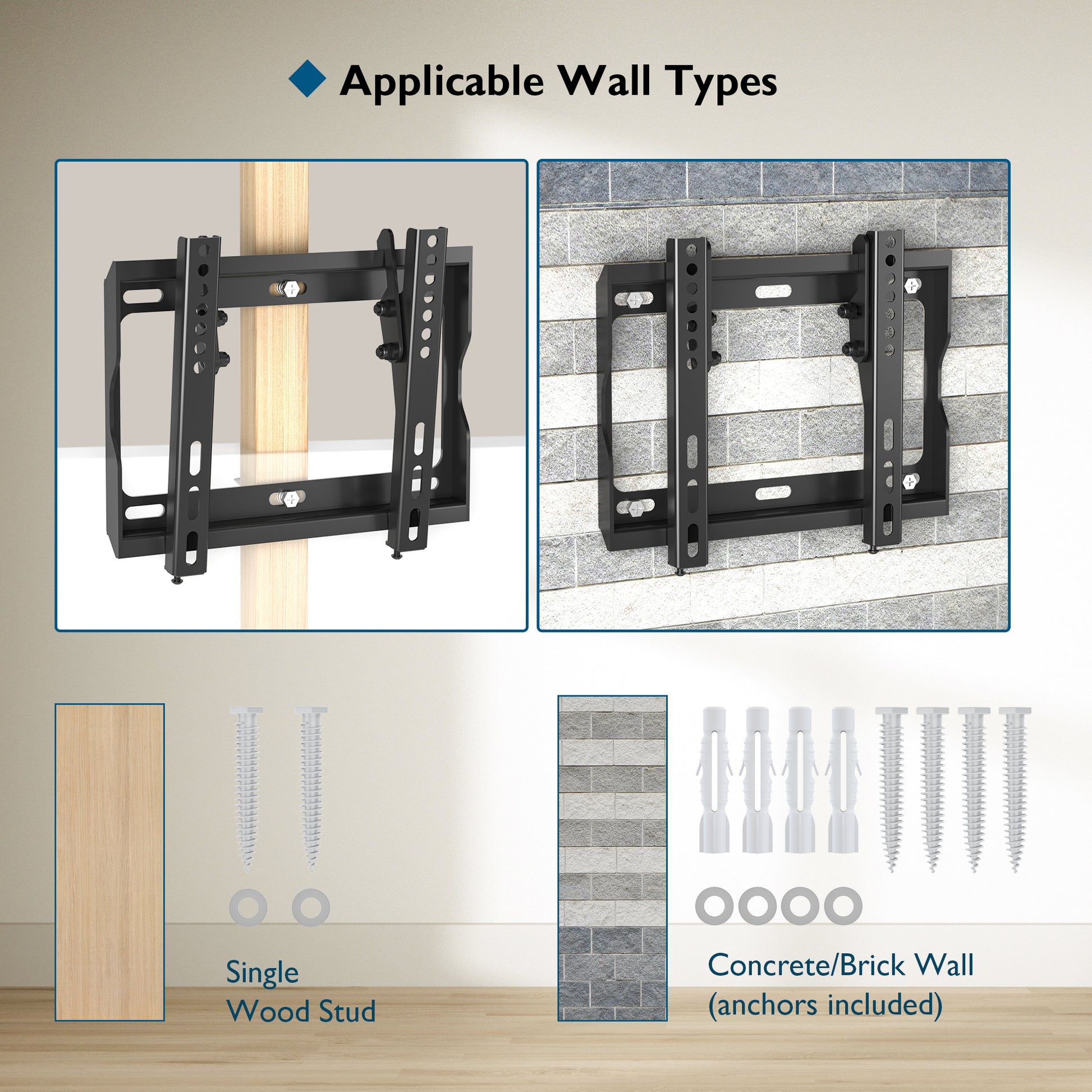 - Easy Installation: This TV wall bracket is suitable for both wood studs and concrete walls (Wall Anchors included and this TV wall bracket is not suitable for plasterboard walls.) and comes with 4 screws, 3 cable ties, 1 spirit level, easy-to-understand instructions and all the necessary product fixtures