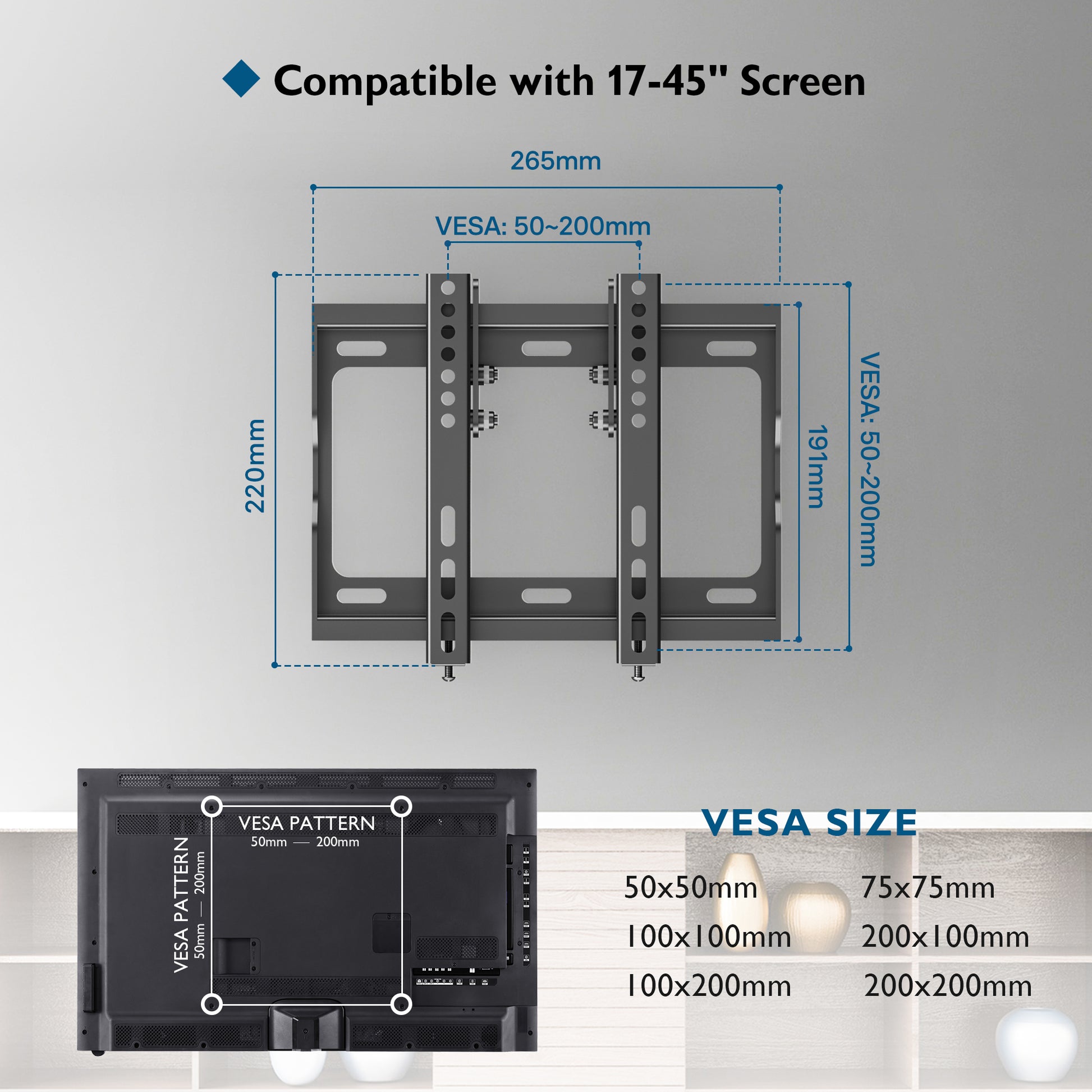 - VESA Mount Compatibility: This TV wall mount fits most 17'' -45'' LED, LCD OLED and Plasma Flat Screen TVs or monitor weighing up to 30 kg; compatible VESA holes: 200x200/200x100/100x200/100x100/75x75/50x50mm. Please confirm the VESA, weight and size specification of your TV before purchasing