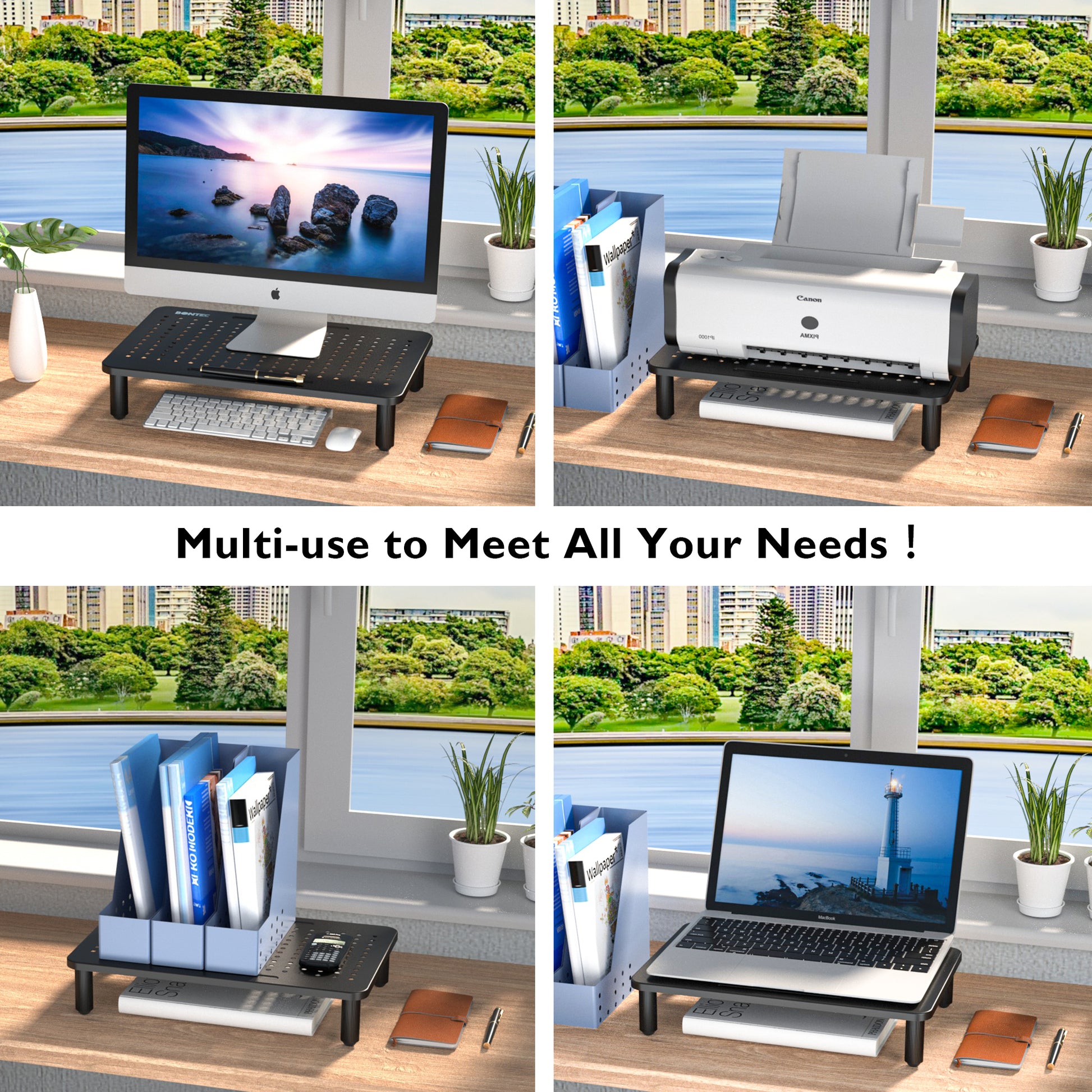 - Ventilated & Space-Saving: Our monitor stand is made of power coated steel with a perforated mesh hole platform (368*231 mm) for better air flow. 2 slots for pen storage and 3 cable holes for cable management keep your desk clean and tidy.
