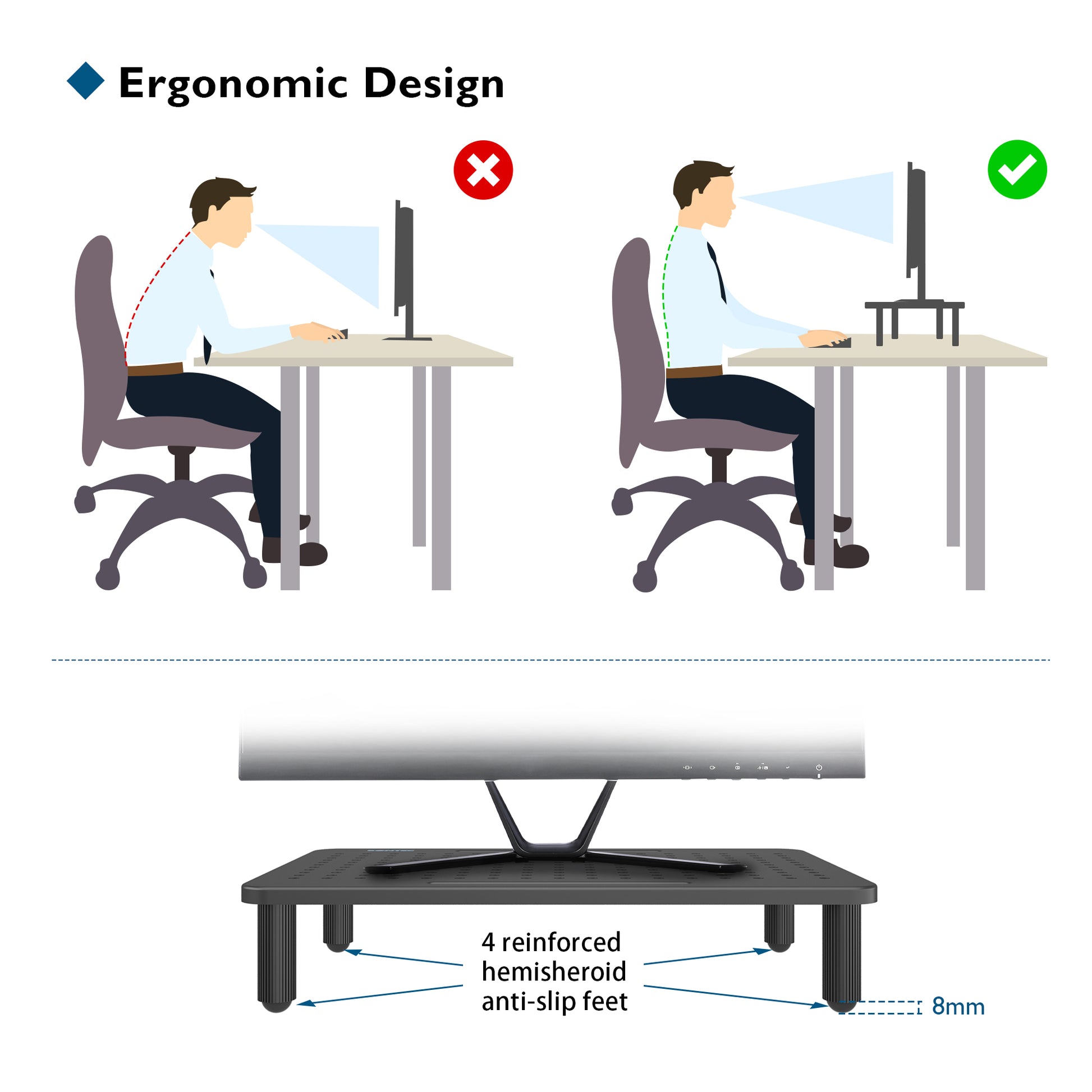 - Ergonomic Design:Our monitor riser allows you to keep your screen at a comfortable eye-level height, effectively improving posture to relieve eyestrain and preventing back & neck pain while working.