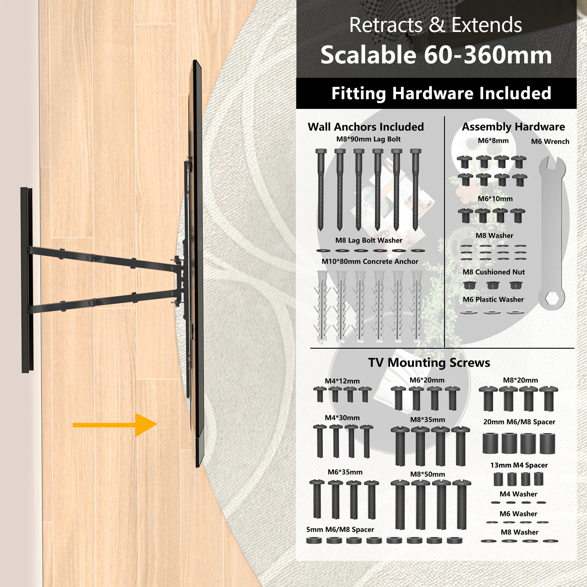 - LOW PROFILE TO WALL & LONG REACH – Our TV bracket support extends out to 360mm from the wall so you can pull out your TV into the perfect position when needed. It retracts 60mm to the wall to save space in your living room while giving you a slim, sleek appearance
