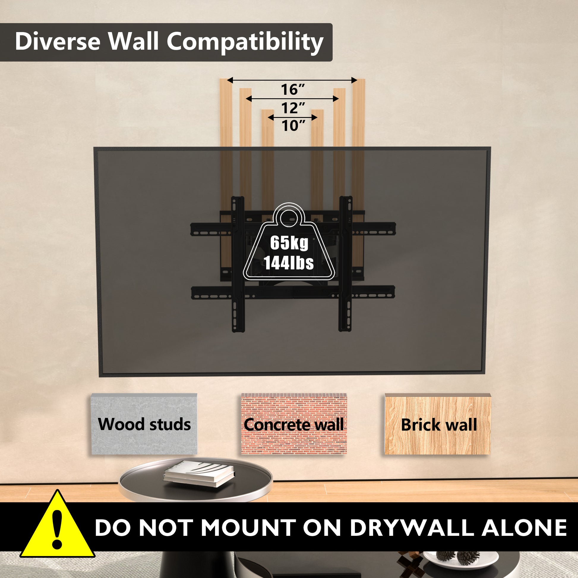 ULTRA STRONG DOUBLE ARMS HOLD UP TO 65KG - Double arms are firmly welded with 24 welding joints to eliminate the risk of sagging in the installation of your TV (maximum load weight up to 65 kg). The TV bracket is manufactured to the highest standard using reinforced, compressed steel. It has a solid back panel with a thickness of 3.5mm to distribute the load so you know your television is safe and secureTV COMPATIBILITY - Fits most 37”-80” flat panel LED, plasma, LCD TVs and fits VESA patterns 100x100 200x100 200x200 300x200 300x300 400x200 400x400 600x400mm. It's compatible with Samsung, Sony, Panasonic, Thomson, Toshiba, Sharp, LG, Philips, JVC and all brands as long as they are VESA compatible. PLEASE CHECK YOUR VESA PATTERN BEFORE PURCHASEFULL MOTION FOR MAXIMUM FLEXIBILITY – Swivels 45° left to right so you can choose the most comfortable viewing angle; tilts 5° up and 15° down to eliminate annoying glare & reduce neck or eye strain. It allows for ±3° rotation adjustment to ensure a level displayLOW PROFILE TO WALL & LONG REACH – Our TV bracket support extends out to 360mm from the wall so you can pull out your TV into the perfect position when needed. It retracts 60mm to the wall to save space in your living room while giving you a slim, sleek appearanceFAST AND EASY INSTALLATION - The TV mount bracket features integrated cable management system to conceal unsightly cables, making your viewing area neat and tidy. It comes complete with illustrated instructions, 1.8m HDMI cable, spirit level, concrete wall anchors and all the necessary product fixtures