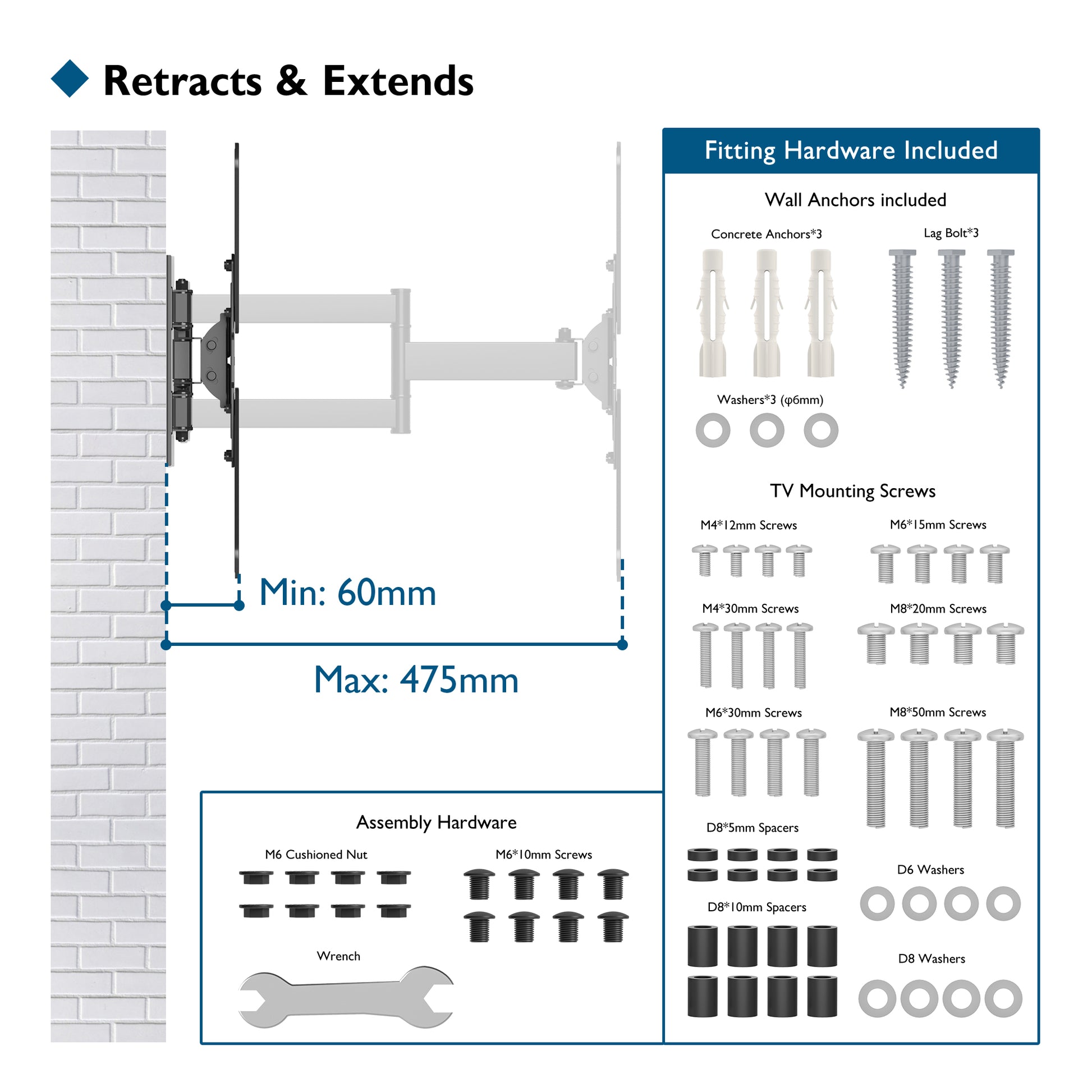 - Saving space: Our TV bracket support extends out to 475mm from the wall so you can pull out your TV into the perfect position when needed. It retracts 60mm to the wall to save space in your living room while giving you a slim, sleek appearance.