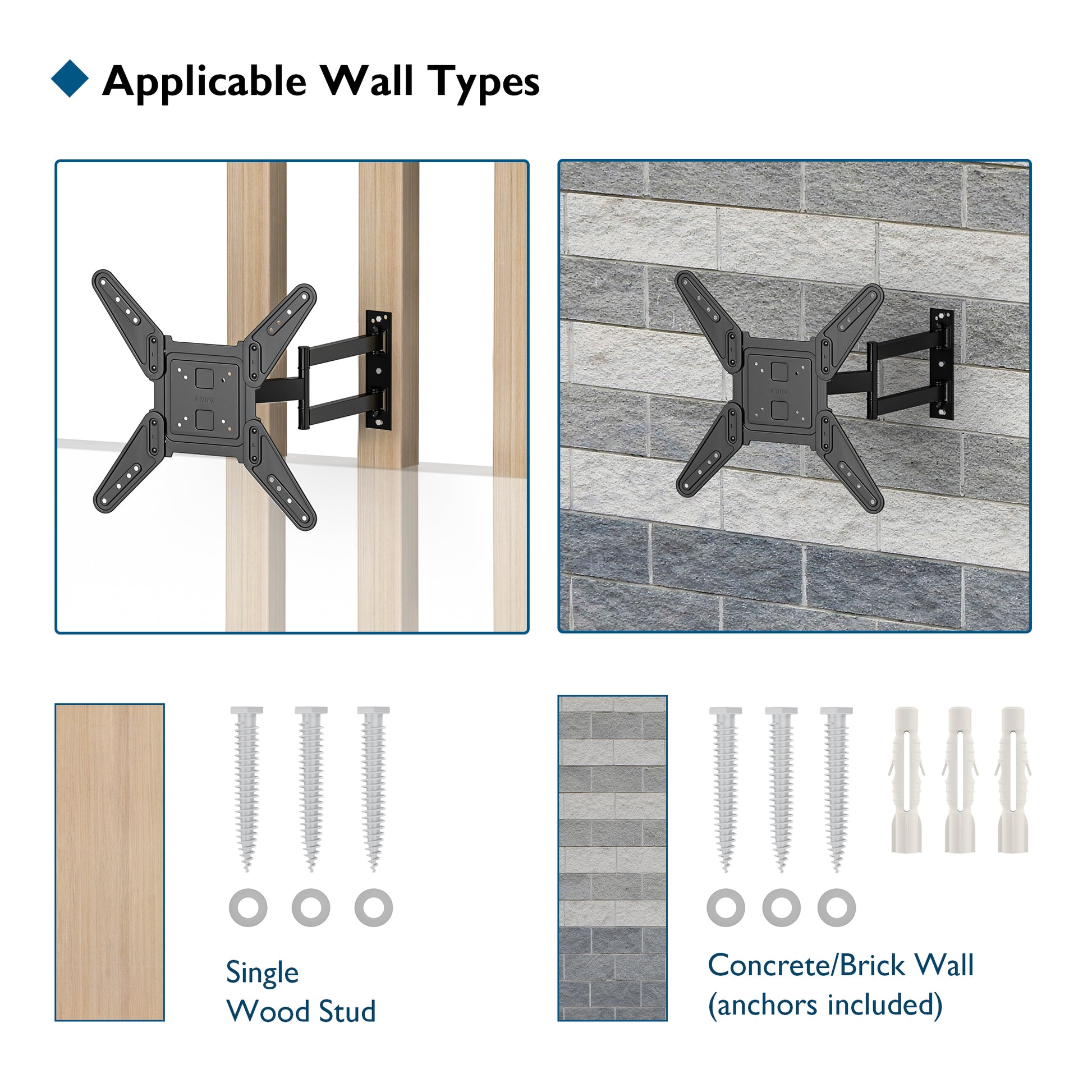 - Ultra Strong: This heavy-duty swivel TV bracket is made with high quality, reinforced, compressed steel to hold LED, LCD, OLED flat and curved screen TVs up to 45kg. This mount fits solid concrete wall or wood stud installation.