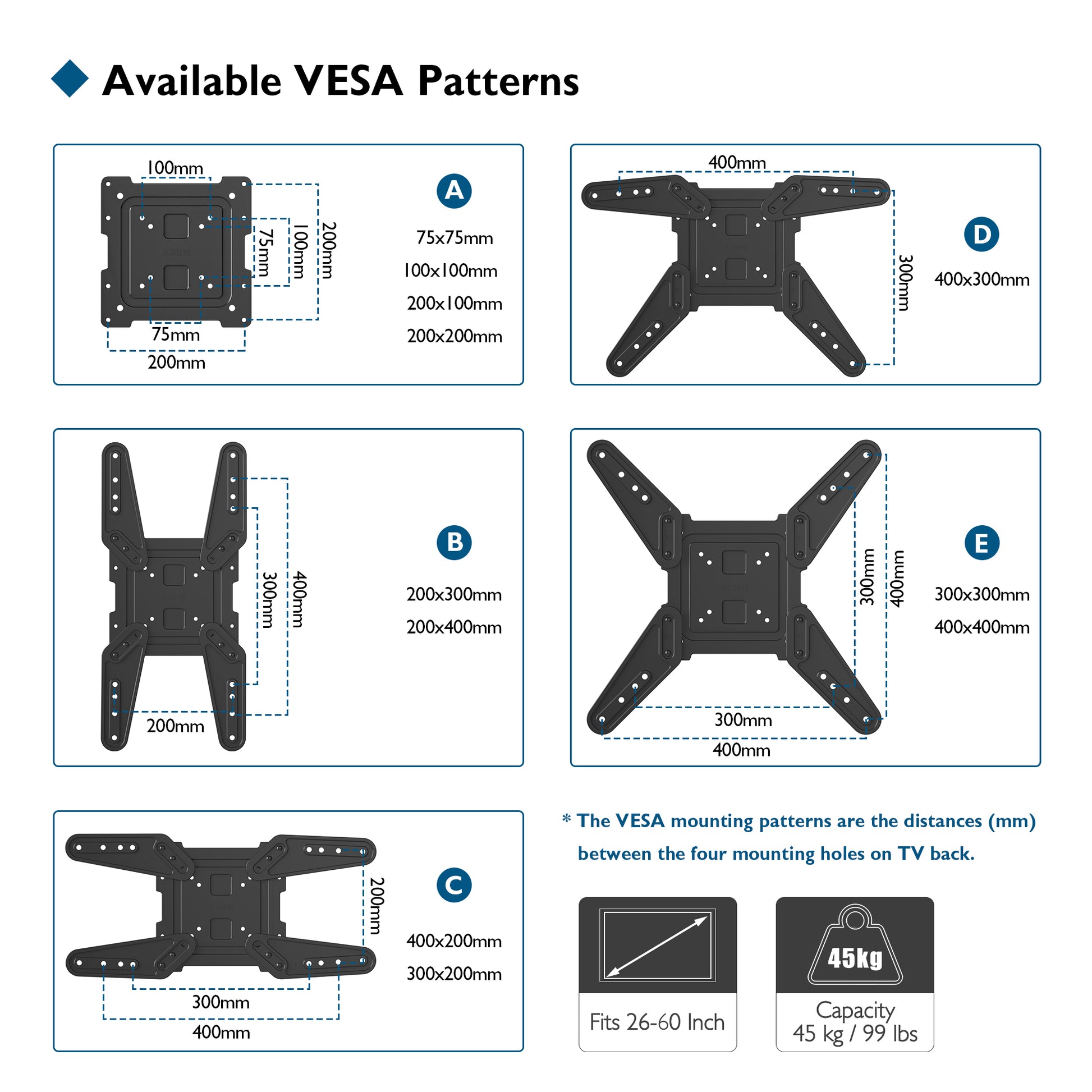 - Universal Compatibility: Our TV wall bracket fits most 26" to 60" TVs, holding up to 45 kg. Removable extender brackets form different combinations achieving on-stop solution for most medium TVs, compatible VESA plate fits VESA mounting holes spacing of 400x400/400x300/400x200/300x300/300x200/200x200/200x100/100x100/75x75mm. Not suitable for VESA 300x400mm and 100x200mm.