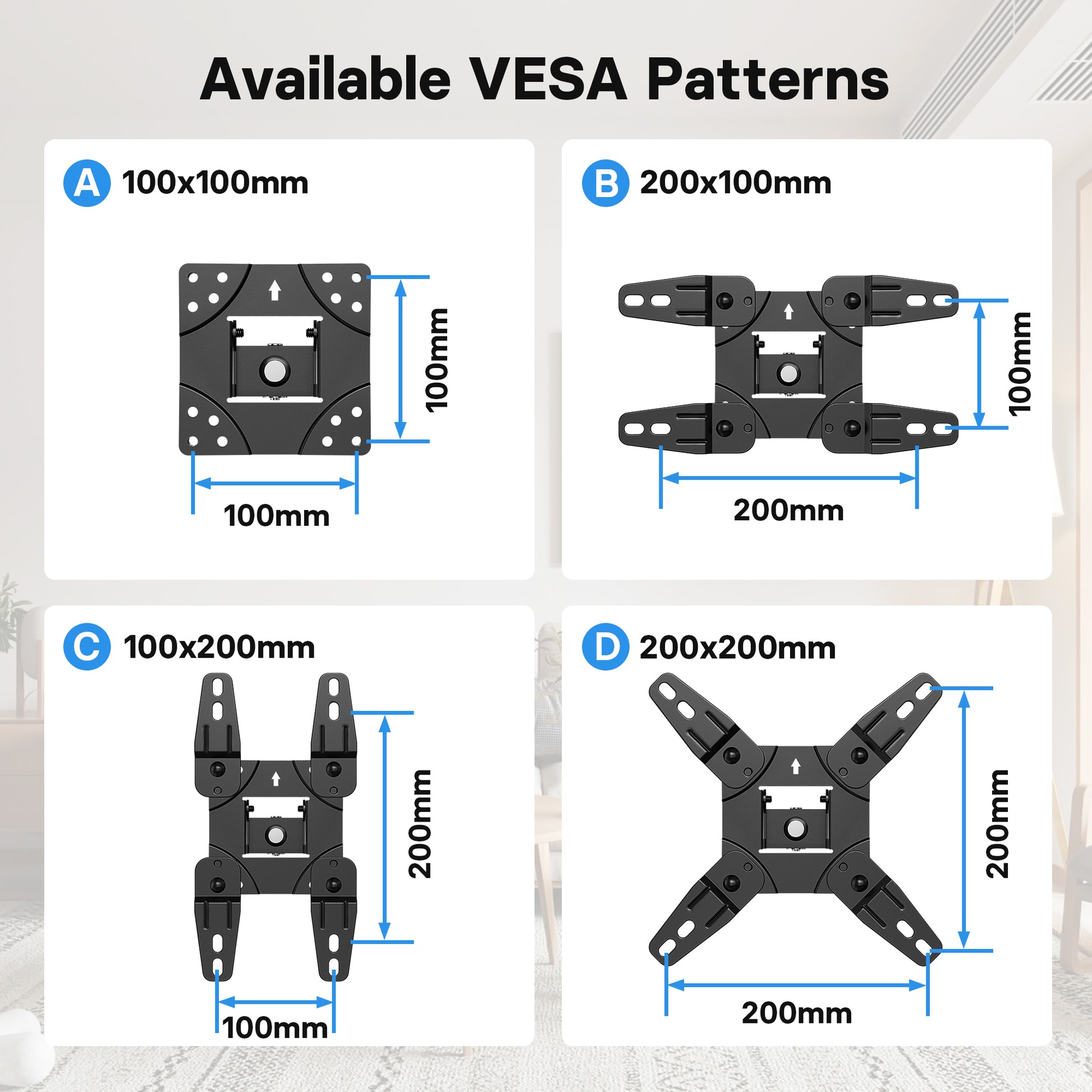 - Universal Compatibility: Our TV wall mount is compatible with most 13 to 42 inch flat and curved TVs weighing up to 25 kg. The VESA plate allows for multiple configurations with spacing of 200 x 200 / 200 x 100 / 100 x 200 / 100 x 100 mm, which offers a one-stop solution for most medium-sized TVs (Please check your TV’s size, weight, and VESA pattern before purchasing).