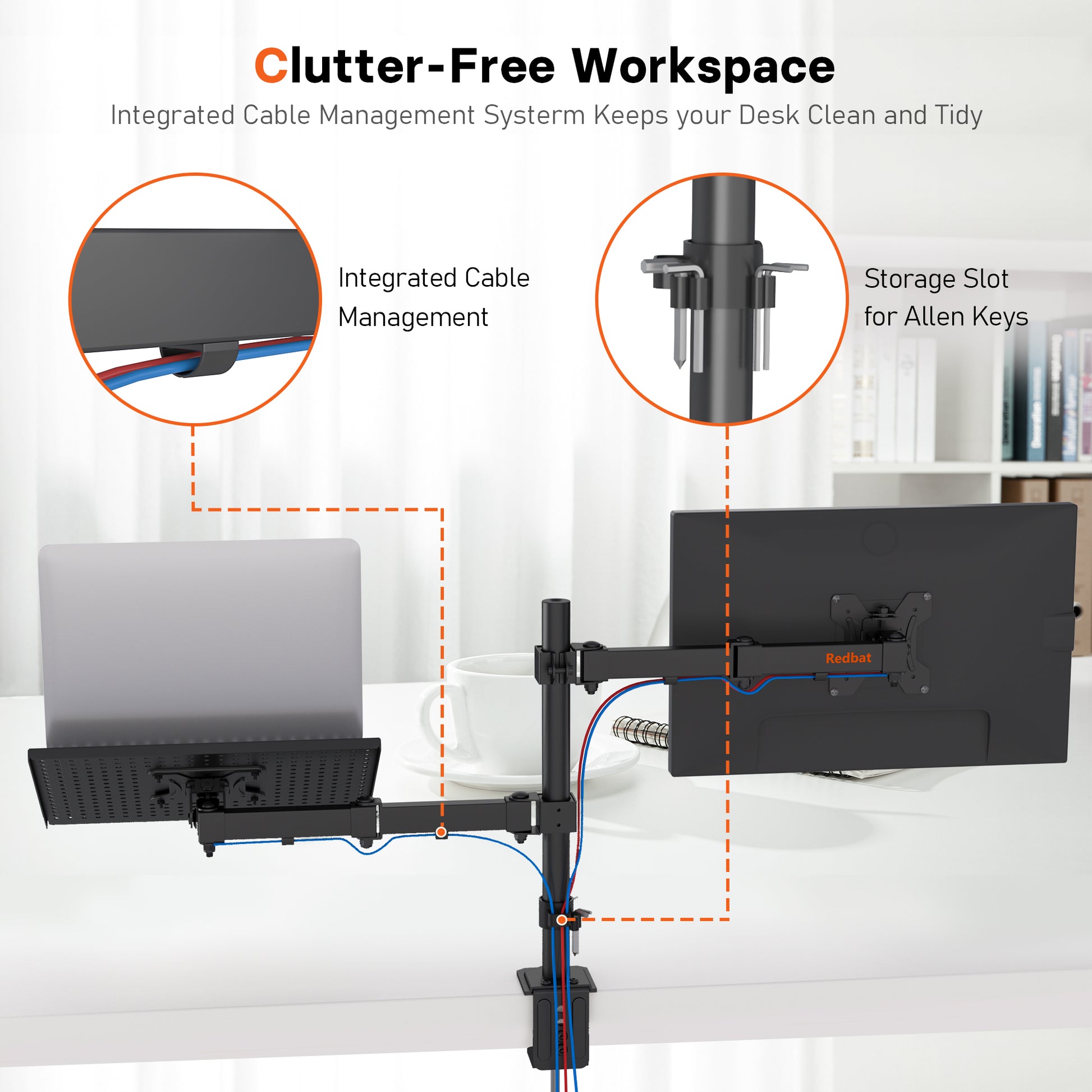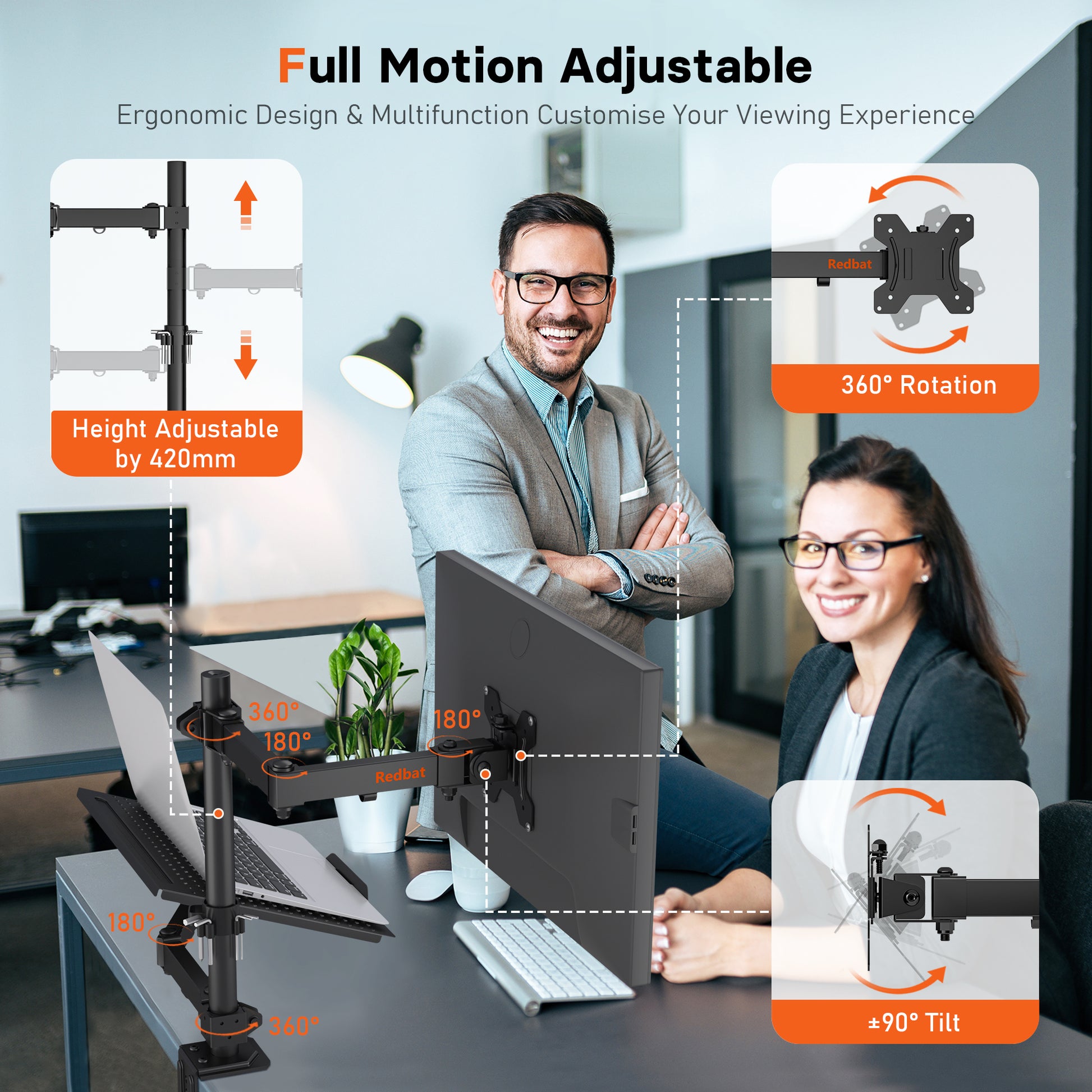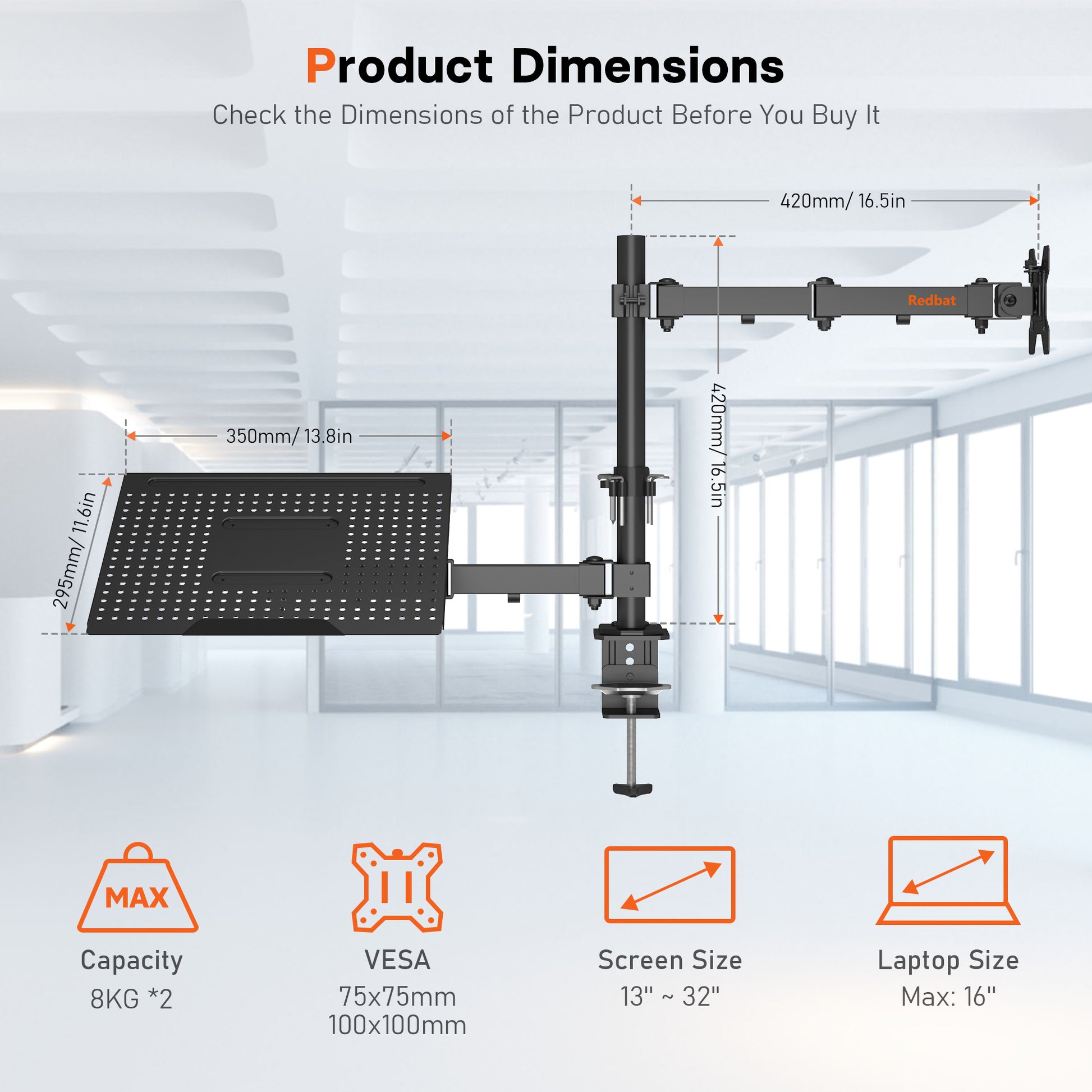 Redbat Monitor and Laptop Stand for 13-32 inch LCD LED Screens, Adjustable Monitor Mount with Laptop Tray Up to 16 inch Laptop/Notebook, Laptop Arm with VESA 75/100mm, 2 Mounting Options