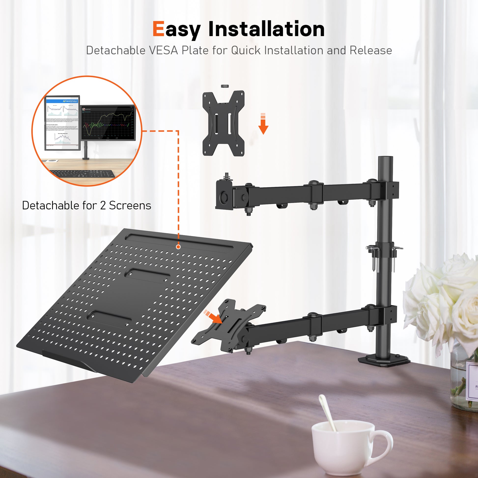 - Ergonomic Monitor Arm with Laptop Tray: This adjustable monitor and laptop stand will provide optimal placement of your screen. Our laptop arm allows you to work more comfortably, increasing your productivity by taking advantage of dual screens, which reduces the need to switch screens for different applications. Choose the correct position to reduce neck and eye strain.