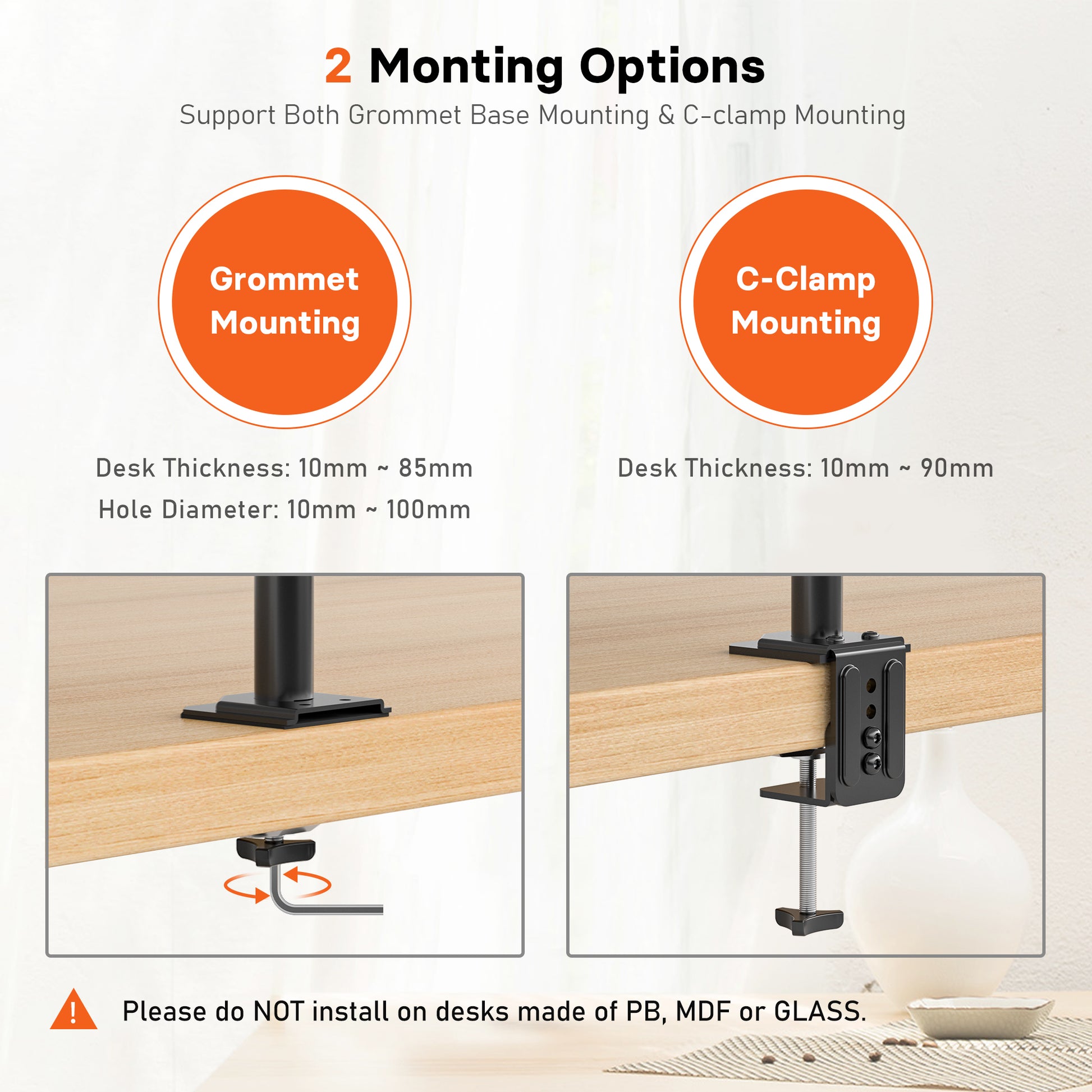 - Two Installation Options: Choose to install by using the C-clamp or the grommet mounting. C-clamp with suitable desk thickness of 10mm to 90mm offers supreme stability to hold your monitor securely in place Grommet mounting is fit for desks with a hole (hole size from 10mm to 95mm). The thickness of the desk for grommet mounting is from 10mm to 80mm. This monitor arm comes with an instruction manual and all necessary fixtures and hardware for installation.