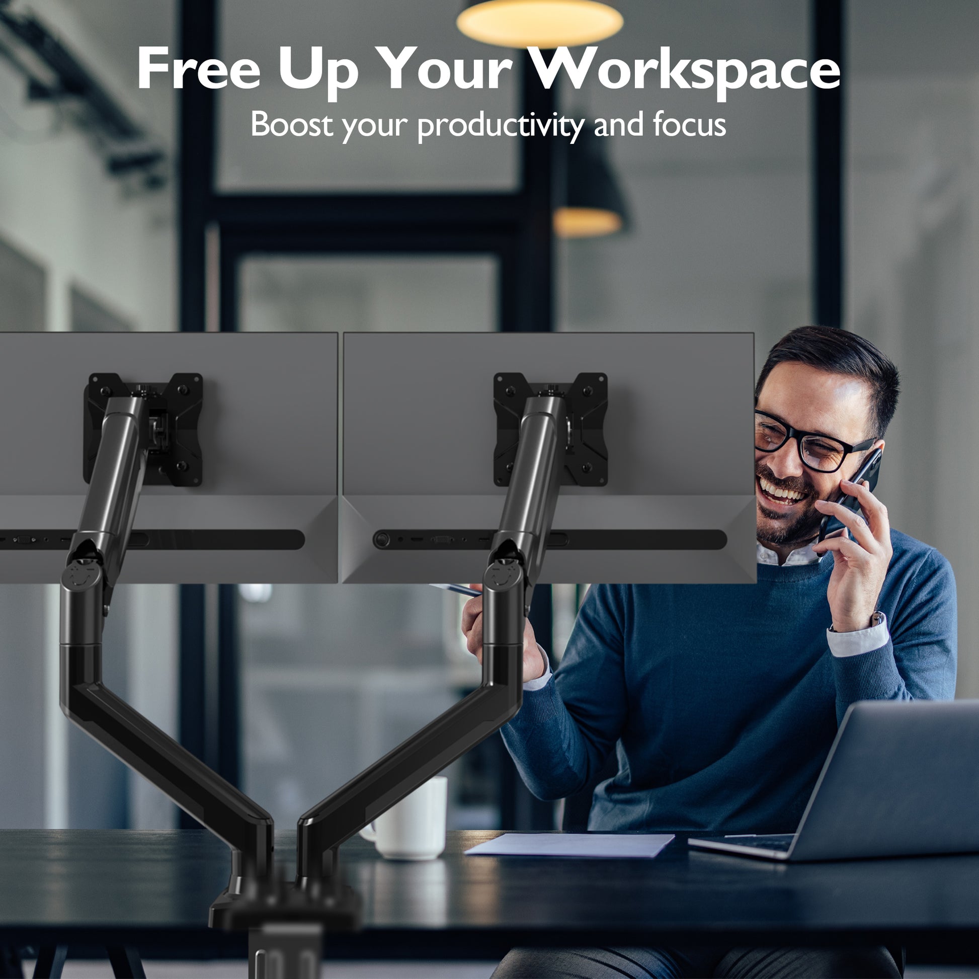 Free up the workspace and enhance your ergonomic setup with the upgraded BONTEC Gas Spring Dual Monitor Desk Mount. The strong gas spring arm accommodates screens up to 32" in size and 9 kg (19.8 lbs) in weight with VESA patterns of 75x75mm and 100x100mm. Featuring full-motion adjustment capabilities including tilt, swivel and rotation, the mount gives the user maximum flexibility for finding a comfortable viewing position. Whether you're a professional working long hours at your desk or individuals prioritizing posture and comfort, this BONTEC monitor desk mount is worth considering.